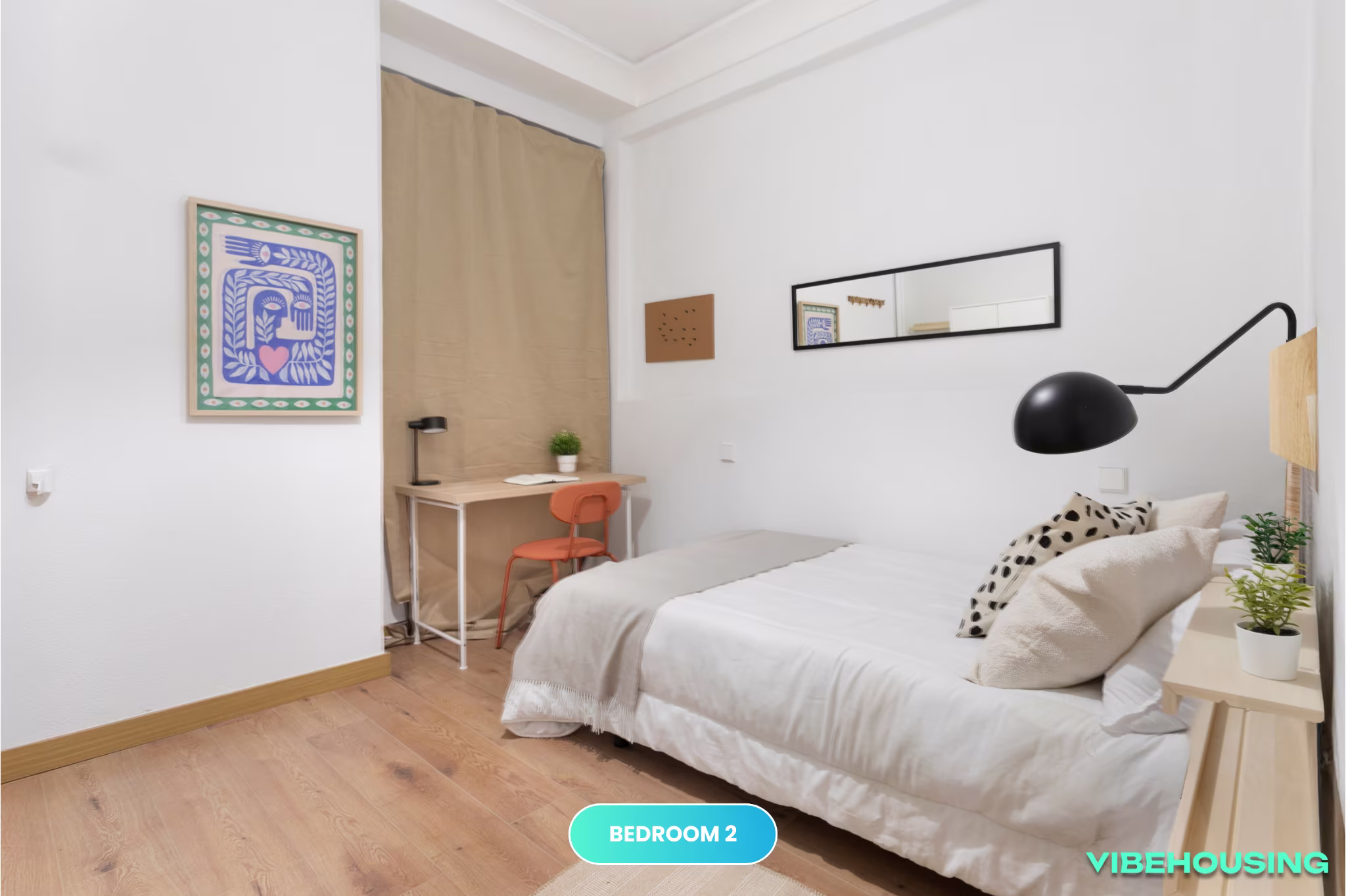 Esta habitación interior de 13 m² destaca por su baño privado en suite, ofreciendo máxima comodidad y privacidad. Equipada con cama de 105 cm, escritorio, silla y armario, es un espacio funcional y acogedor para estudiar y relajarse. Perfecta para quienes buscan un ambiente tranquilo dentro de un coliving moderno.